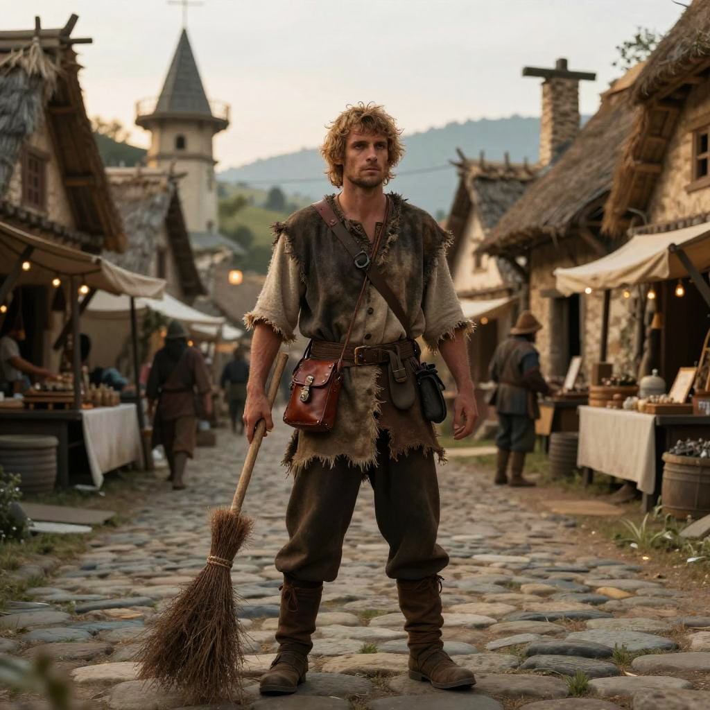 Peasant DnD adventurer in tattered clothing, carrying a small leather pouch and a worn broom, standing on a cobblestone road of a fantasy village, surrounded by thatched roofs and market stalls, dusk lighting, highly detailed fantasy art.