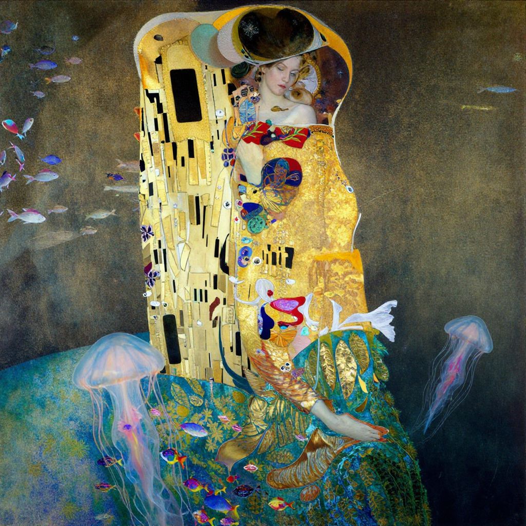 Gustav Klimt-style painting of a woman in a golden dress, surrounded by vibrant fish and jellyfish, with an ornate, golden