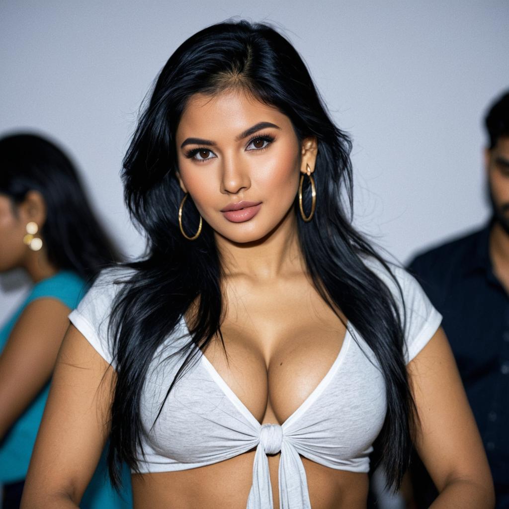 Close-up portrait of a South Asian woman with long black hair wearing large gold hoop earrings and a white knotted crop top, showing cleavage and midriff. She has smooth skin, subtle makeup, and a mole under her mouth. The background is blurred with two other people partially visible, emphasizing the solo focus on the woman.