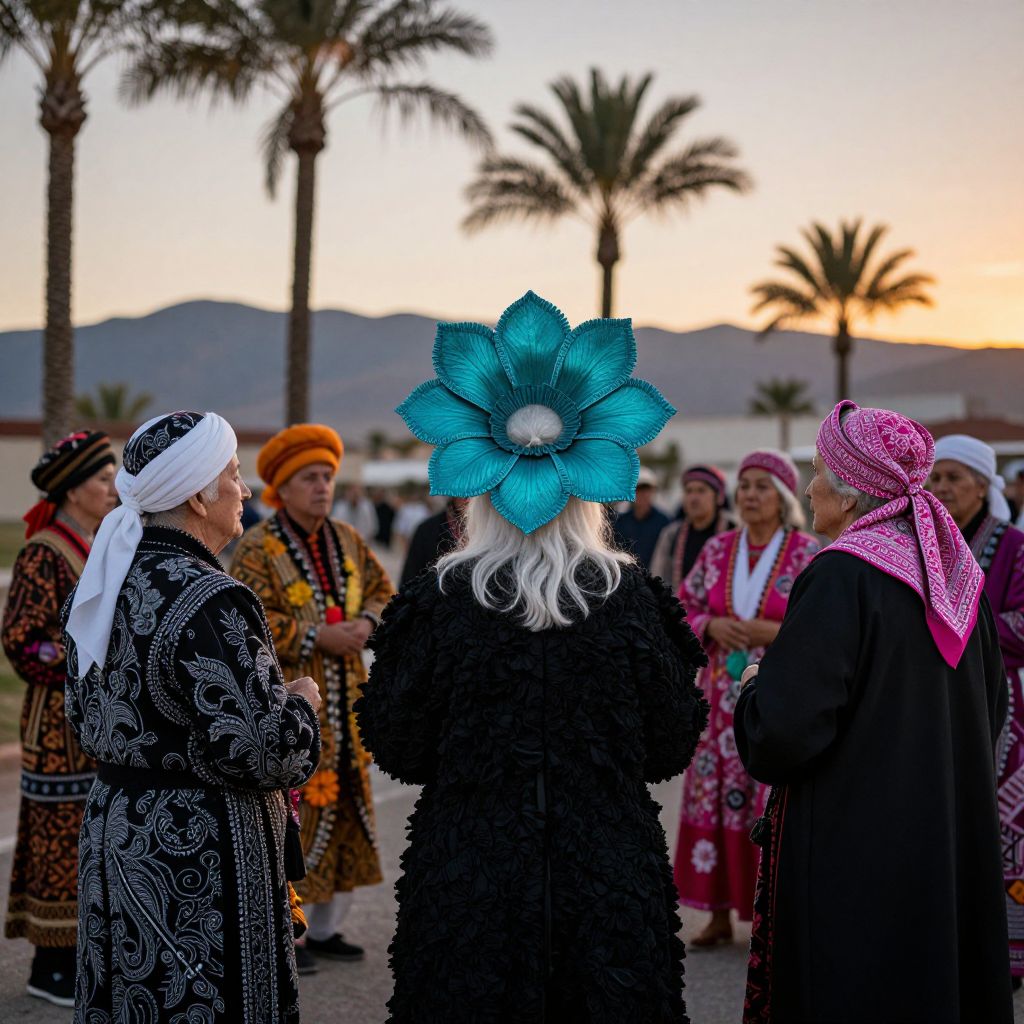 In this captivating image, a group of elderly individuals, adorned in elaborate and vibrant costumes, stand in a semi-circle, their backs to the viewer. The central figure, a woman with striking white hair, wears a massive, turquoise flower-shaped headpiece that dominates the scene. Her attire is a black, textured garment that contrasts sharply with the bright headpiece. To her left, another individual sports a black outfit with intricate patterns and a white turban, while to her right, a person in a black robe with a pink and white patterned hood adds to the diversity of the group. The background features tall palm trees and distant mountains, bathed in the warm hues of a setting or rising sun. The overall composition, with its rich colors, intricate details, and dynamic poses, creates a sense of depth and movement, enhanced by the use of a 50mm lens and a shallow depth of field that blurs the background, drawing focus to the subjects. The image is beautifully color graded, with a moody, cinematic lighting that enhances the dramatic effect.