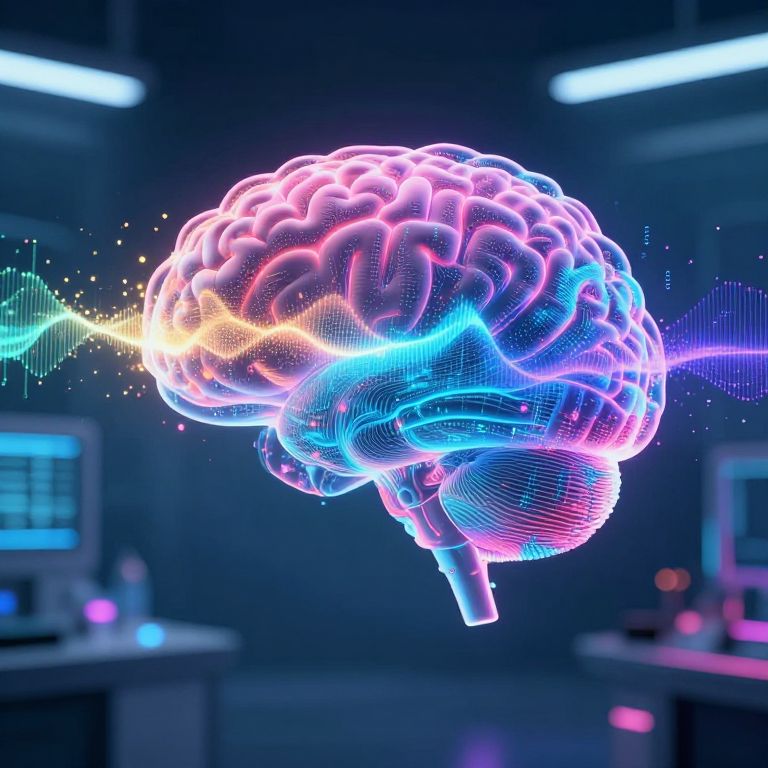 Neon-lit, digital CGI of a glowing, colorful brain with vibrant blue, pink, and purple hues, set against a futuristic lab background.
