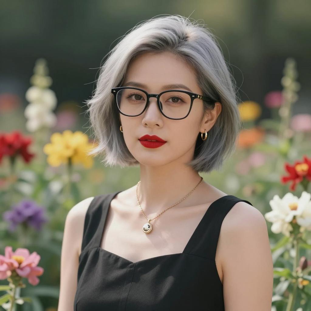 Stylish woman with brown bob haircut wearing black sunglasses, large hoop earrings, and long red gloves, kissing red rose petals. She is dressed in a strapless red dress. A large bouquet of red roses wrapped in black paper is visible in the background, with green foliage behind. A reflective silver spoon is placed near the bottom right of the image. The setting appears to be outdoors.