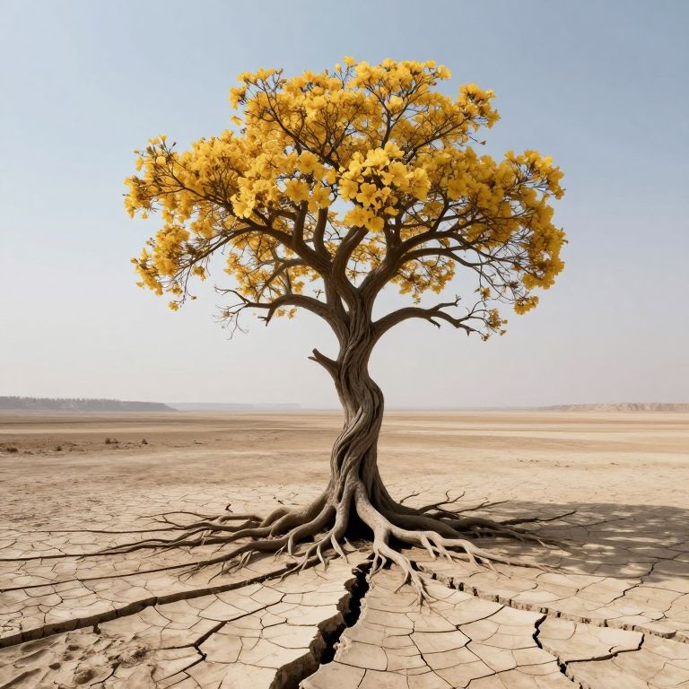 Photograph of a solitary tree with bright yellow flowers and a twisted, gnarled trunk standing in a cracked, dry desert landscape. The tree's roots spread out across the parched, beige ground, emphasizing the arid environment. The sky is clear and blue, contrasting with the dry earth. The tree is centered in the image, with a horizon line in the background that is slightly blurred. The photograph has a surreal, almost hyper-realistic quality, highlighting the resilience of the tree in a harsh setting.