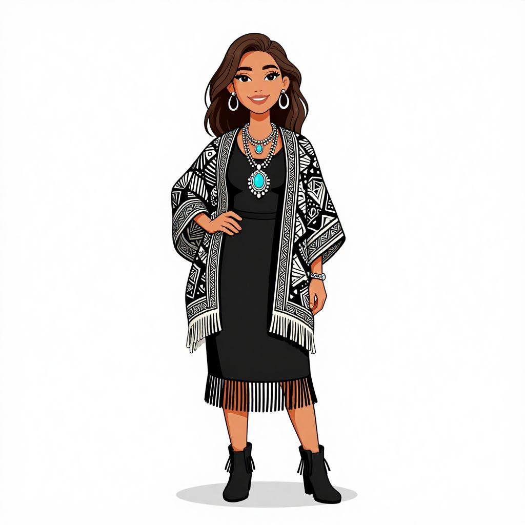 Woman with pretty face and pretty hair. smiling Woman, bohemian, oversized black and white patterned shawl with fringe, black knee-length dress with fringe at the hem, black ankle boots with fringe, layered necklaces with silver and turquoise, large statement pendant. --sref 1467