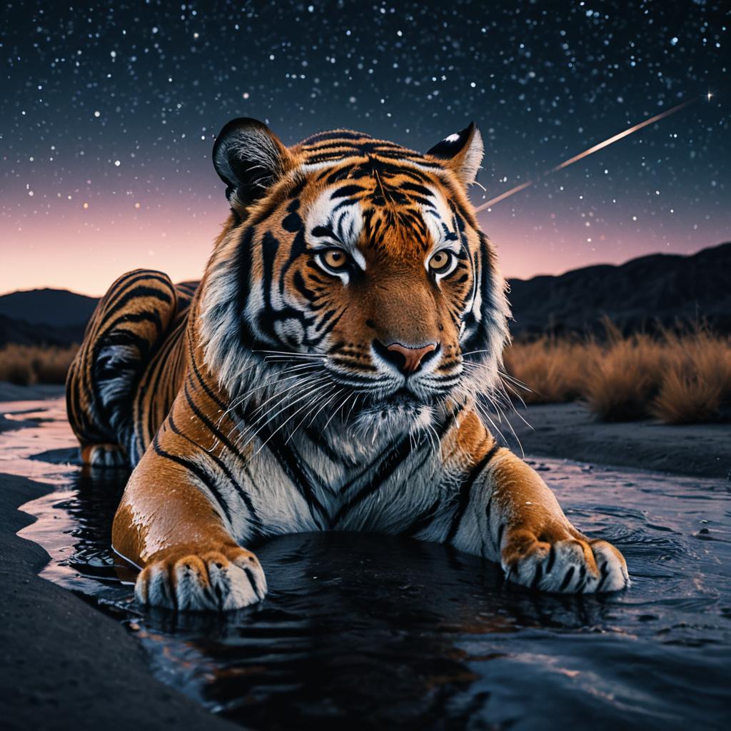 Dry brush liquid-style art of a liquid oasis shimmering, with a vast desert at dusk. The hyperrealistic, cinematic rendering includes smooth shading, post-processing techniques, and advanced visuals (8K resolution, RTX, UHD), with beautiful color grading and a focus on realism.