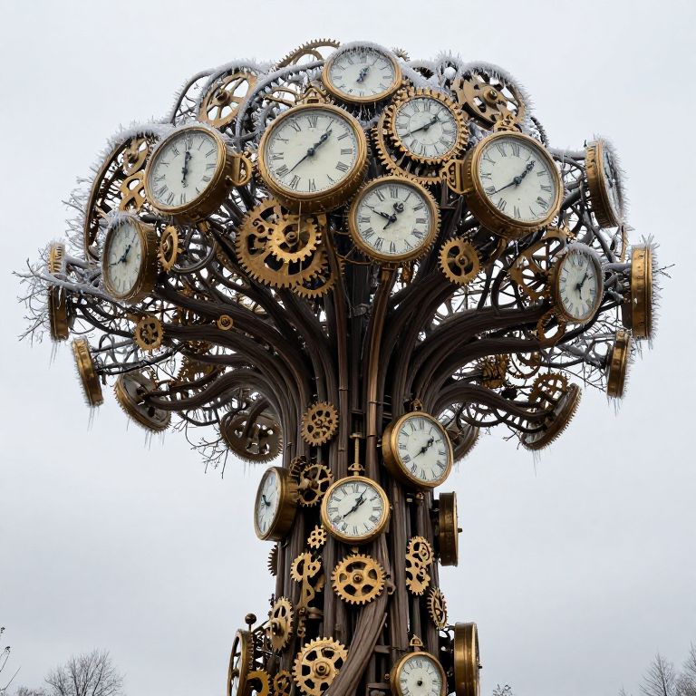Towering tree-like structure composed of numerous vintage clocks and intricate mechanical gears, its sprawling branches adorned with frozen moments of time, while the robust trunk reveals complex cogs and mechanisms symbolizing the passage of centuries.
