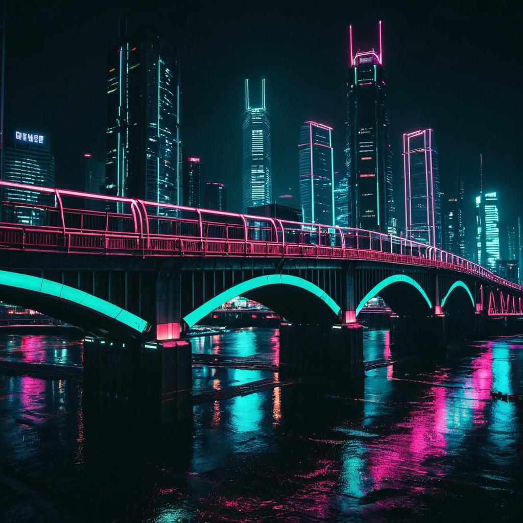 Cyberpunk cityscape at night with vibrant neon lights, neon-lit skybridges connecting skyscrapers, towering skyscrapers, moody and atmospheric lighting.