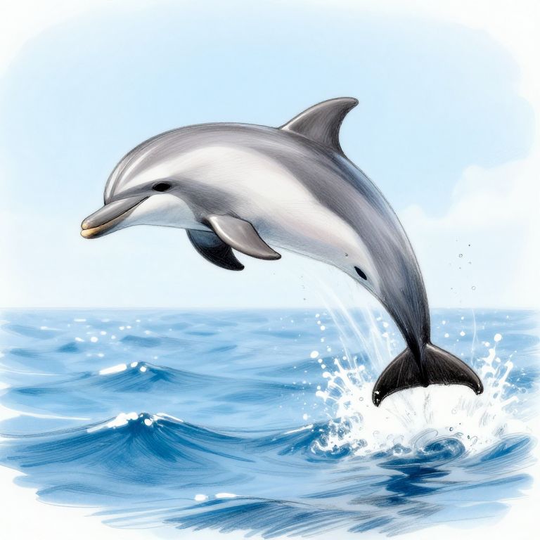 Dolphin jumping drawing, a dynamic sketch of a dolphin leaping out of sparkling ocean waves, captured with fluid pencil strokes and soft shading, emphasizing motion and grace against a serene blue sky background.