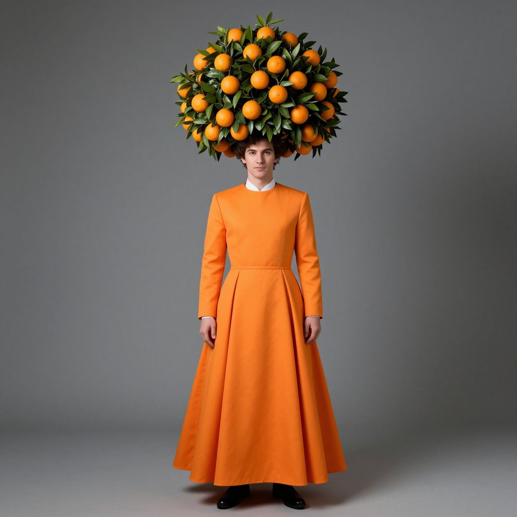 Orange Tree Costume, man in a long dress with oranges on his head