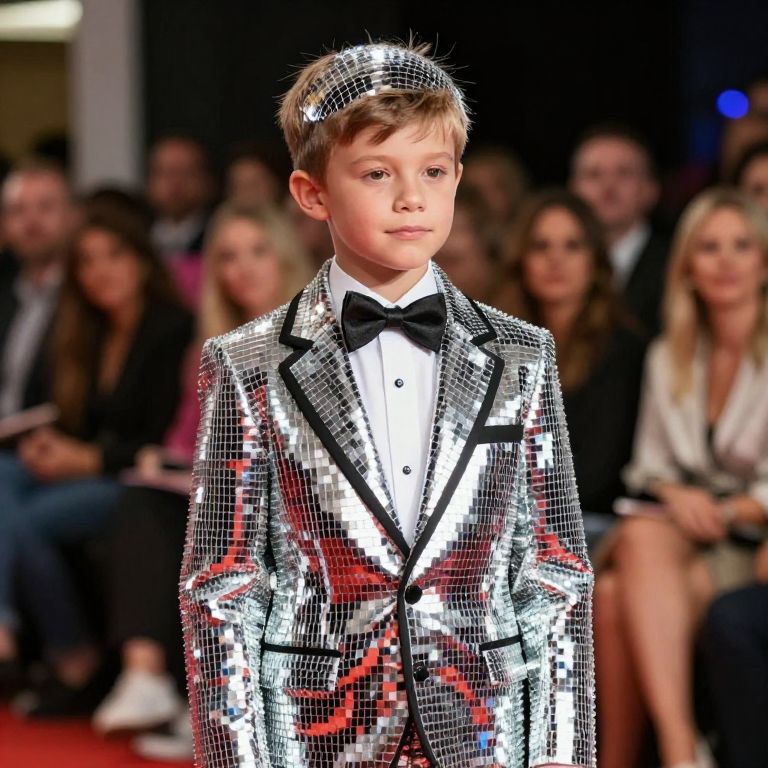 Photograph of a young boy in a silver sequin tuxedo with black bow tie, standing confidently on a red carpet, with blurred audience in