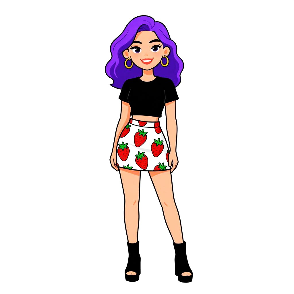 Cartoon-style drawing of a purple-haired woman with large gold hoop earrings, black top, white strawberry-print skirt, black ankle boots.