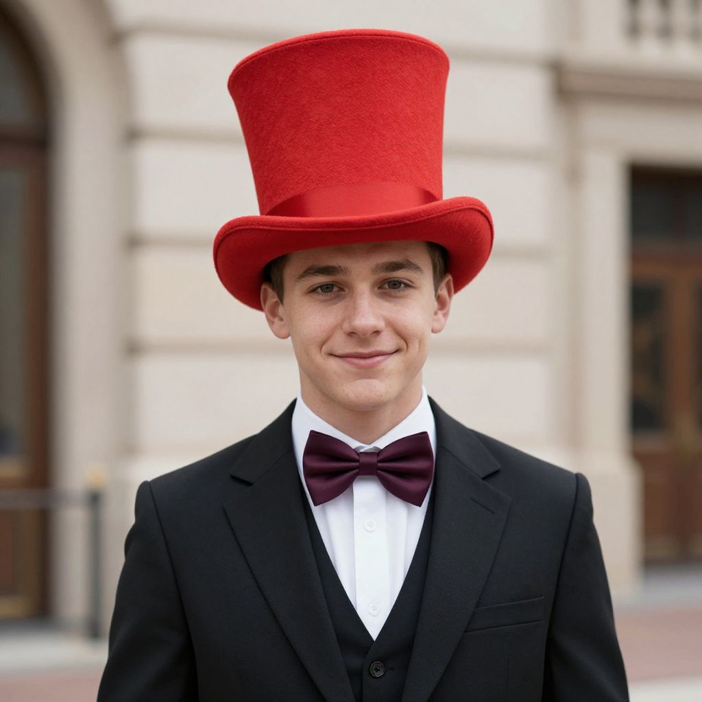 Photograph of a young Caucasian man with fair skin and brown eyes, wearing a black tuxedo with a white dress shirt and a maroon bow tie. He is topped with a bright red, tall, velvet top hat. The man has a slight smile and is standing in front of a blurred, classical-style building with beige stone walls and dark wooden doors. The contrast of the red hat against the black suit and white shirt creates a striking visual. The background is out of focus, emphasizing the subject. The image has a crisp, vibrant quality.