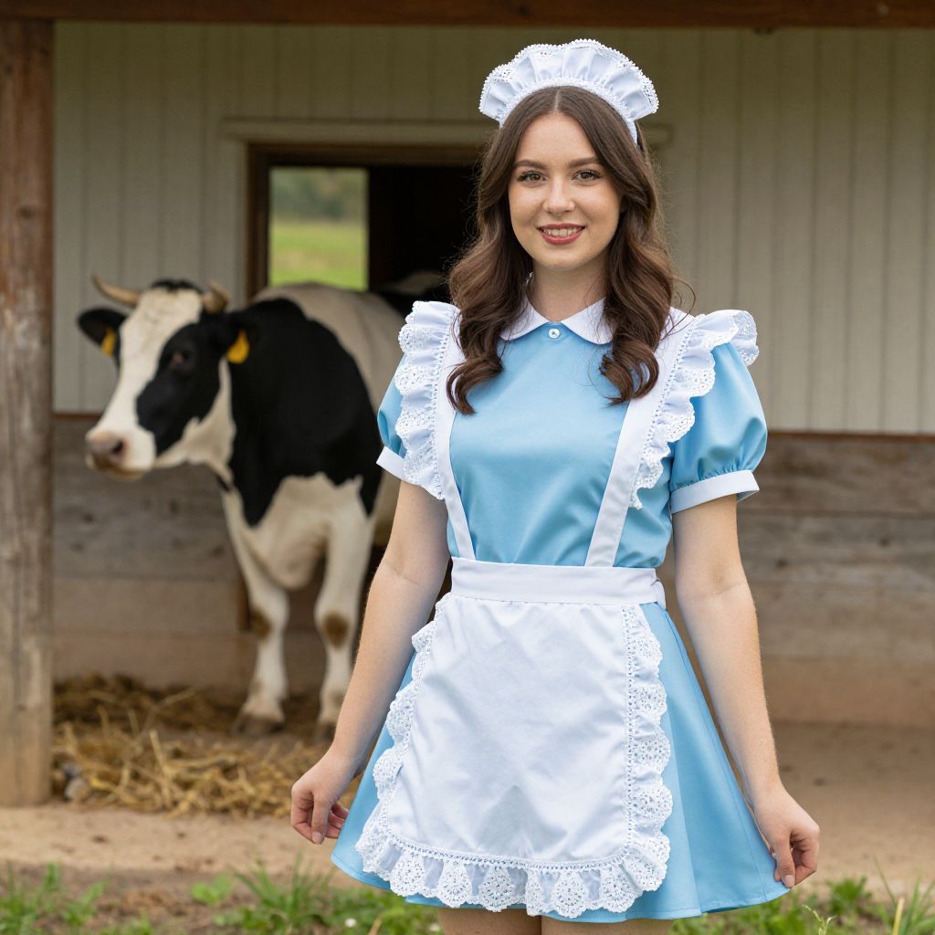 Photograph of a smiling brunette woman in a blue and white maid outfit with lace trim, standing in front of a black-and-white cow in a rustic