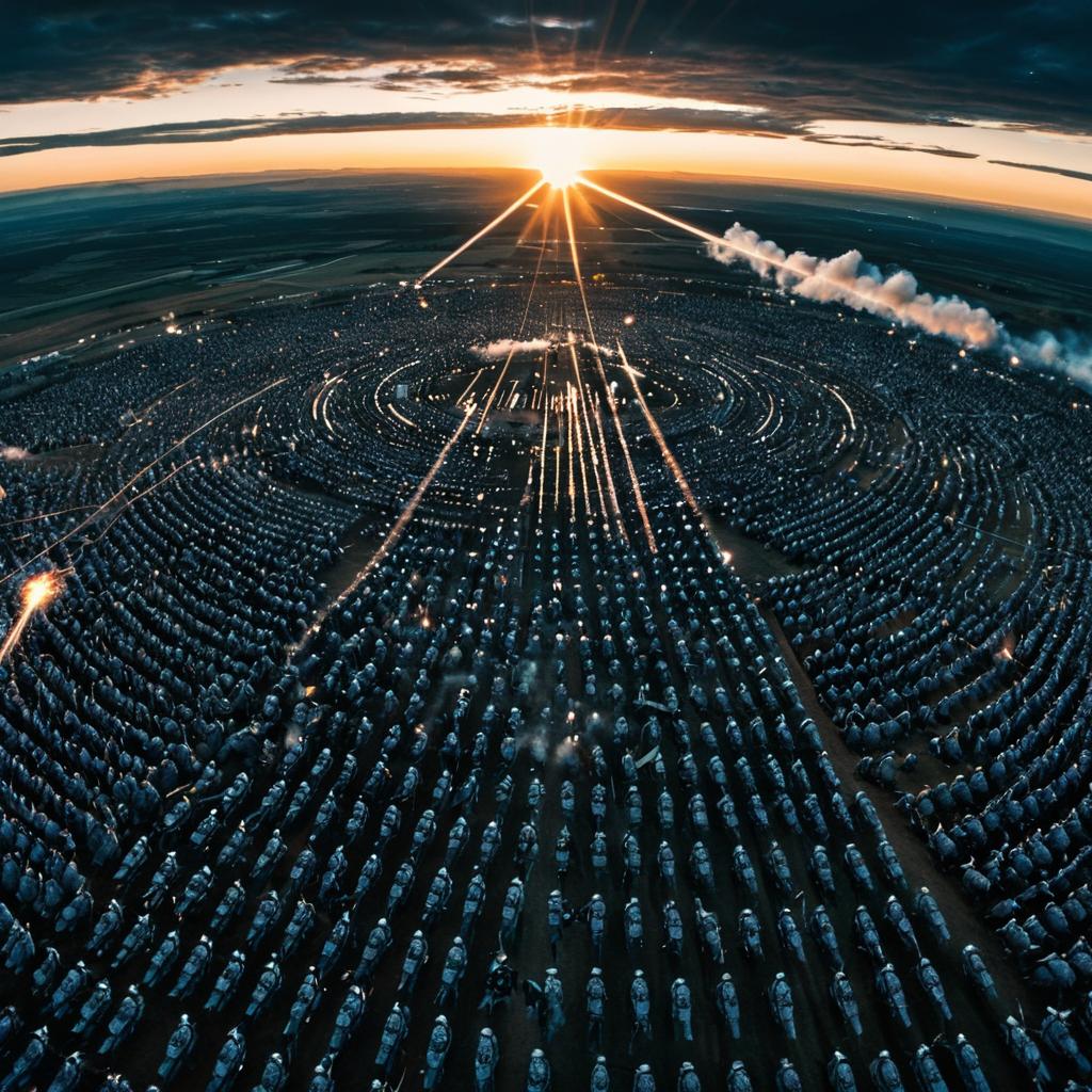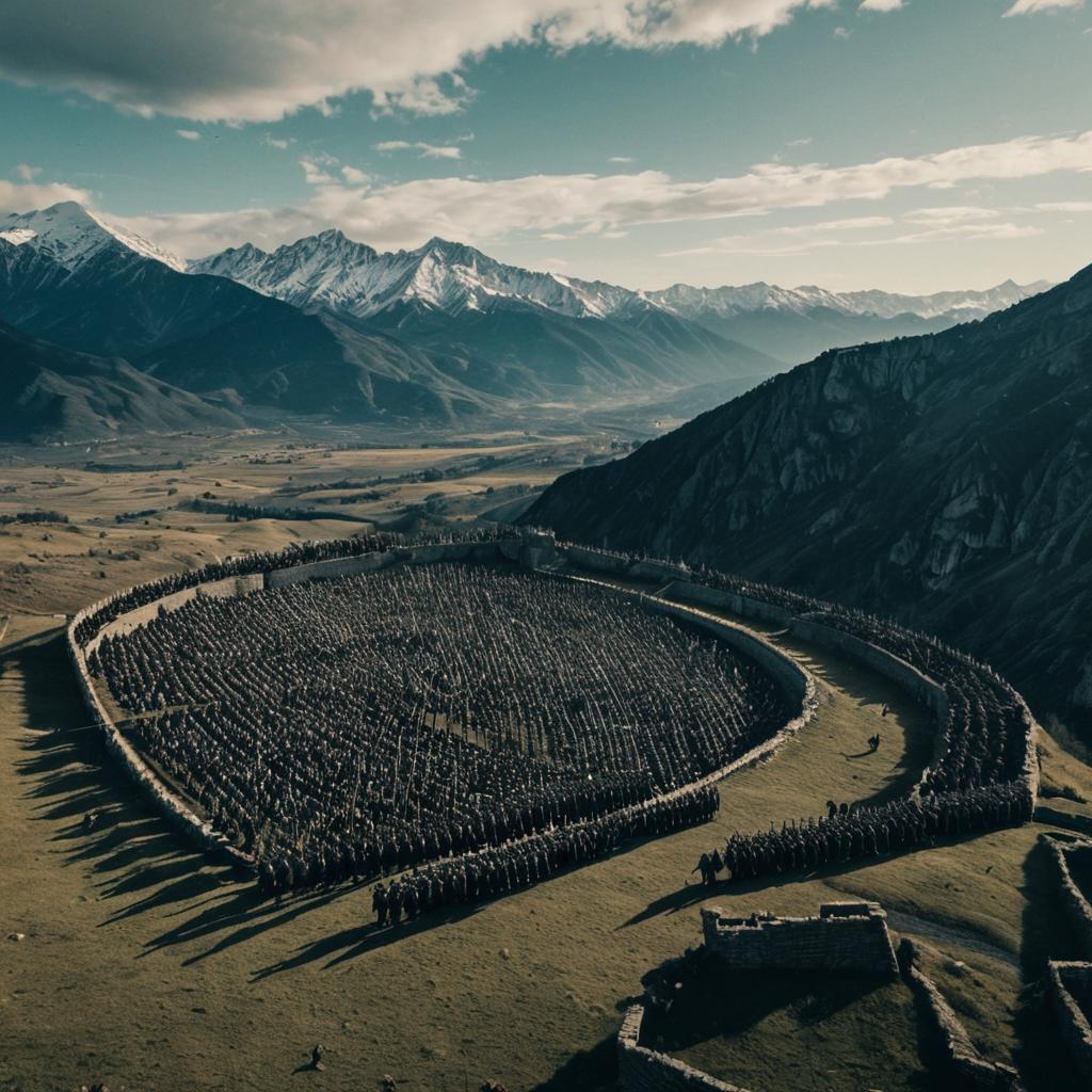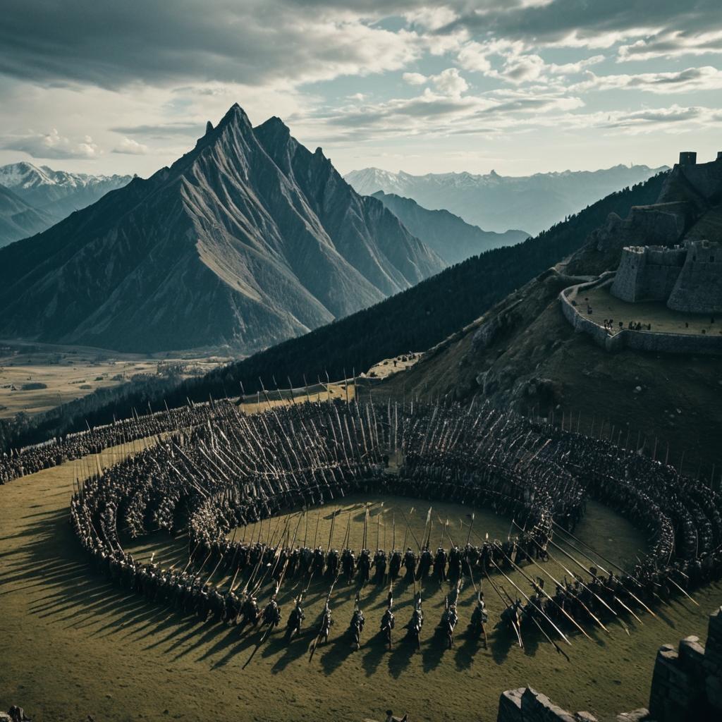 Ancient mountain fortress, shot with a ultra-wide lens from a height of 20 meters. Clear image. 4k, the plain in the foreground. large number of archers. The screen is distorted by the curvature of the lens. Fighting is happening everywhere. The armies line up and face each other. high altitude sky shots of armies beyond the horizon. jagged peaks at dawn, with clouds and rising smoke.