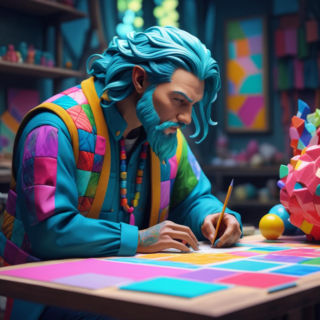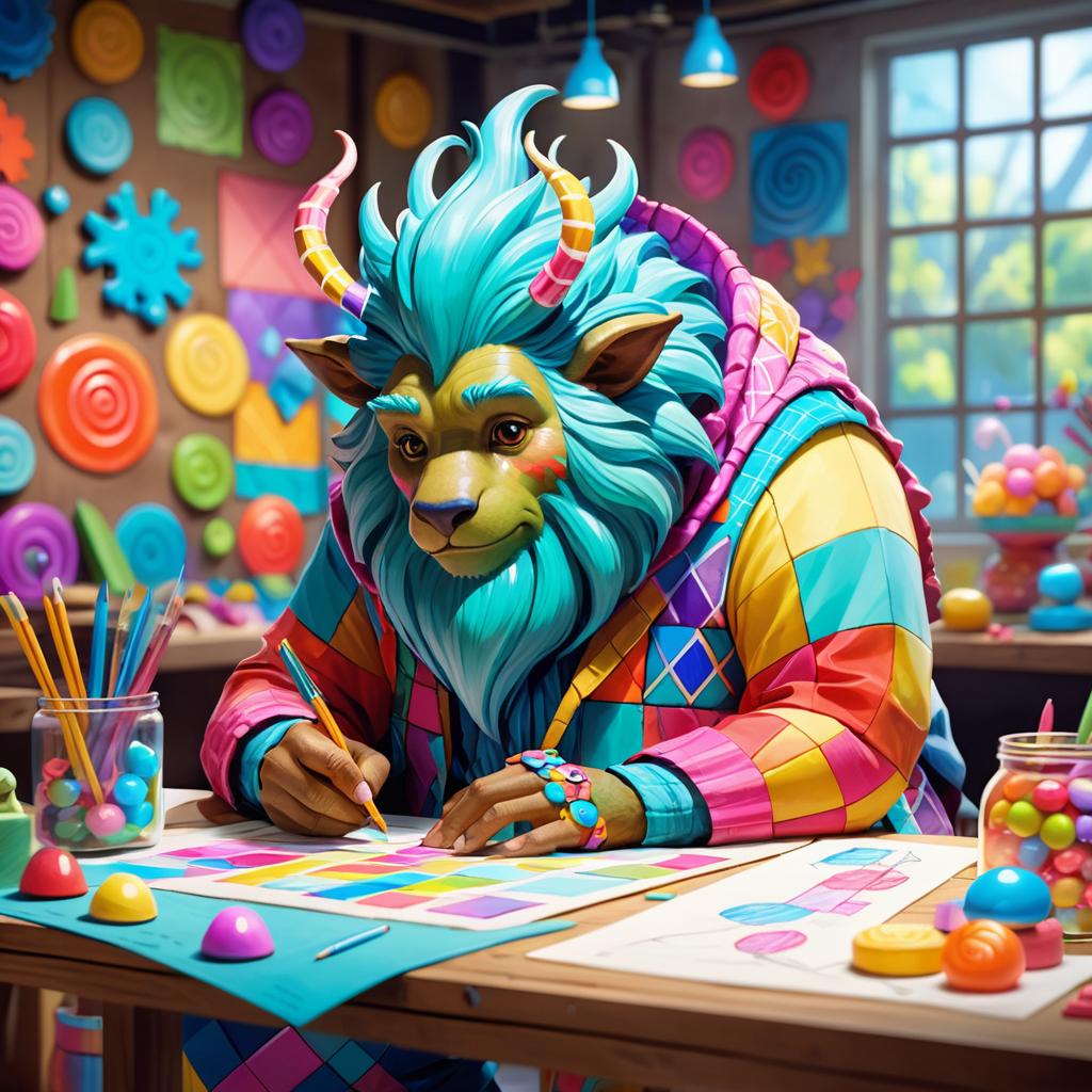 A man with teal hair and multicolored horns, wearing vibrant patchwork clothing, is focused on sketching blueprints at a cluttered table. The workshop is filled with bright, candy-shaped decorations and objects, creating a whimsical atmosphere. The subject wears glasses and a bead bracelet, working intensely on his artistic project.