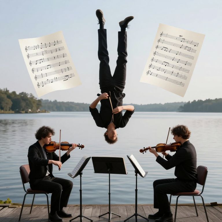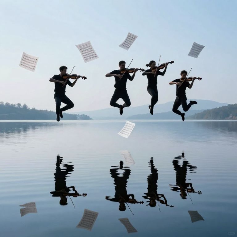 Silhouetted musicians in mid-jump, playing violins, with sheet music floating, reflected in calm lake water, under a clear blue sky