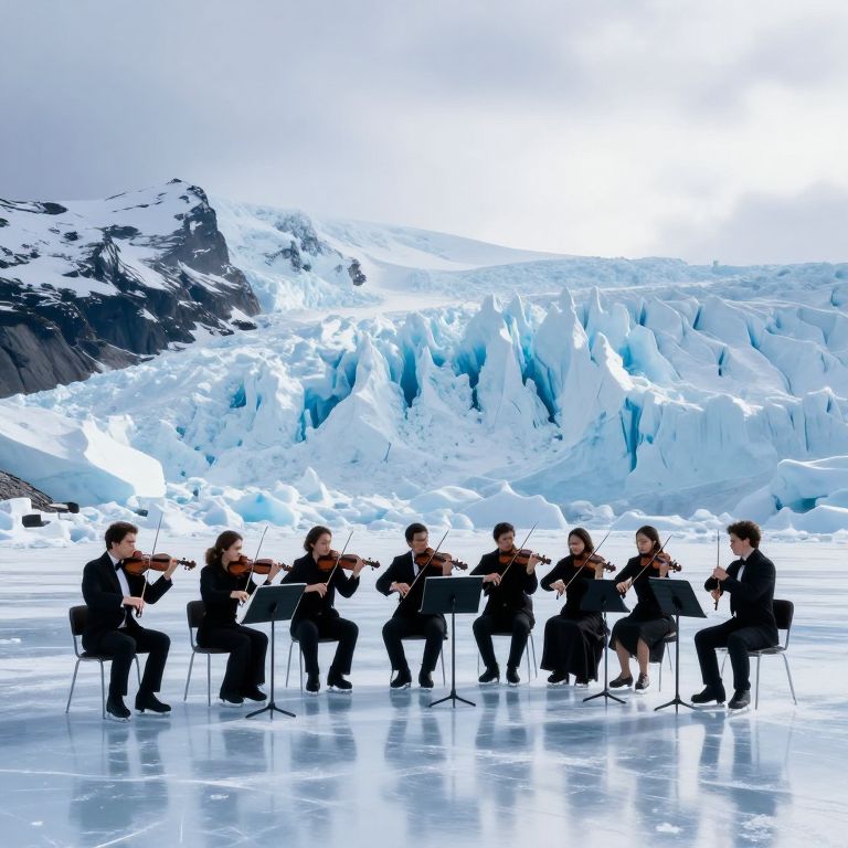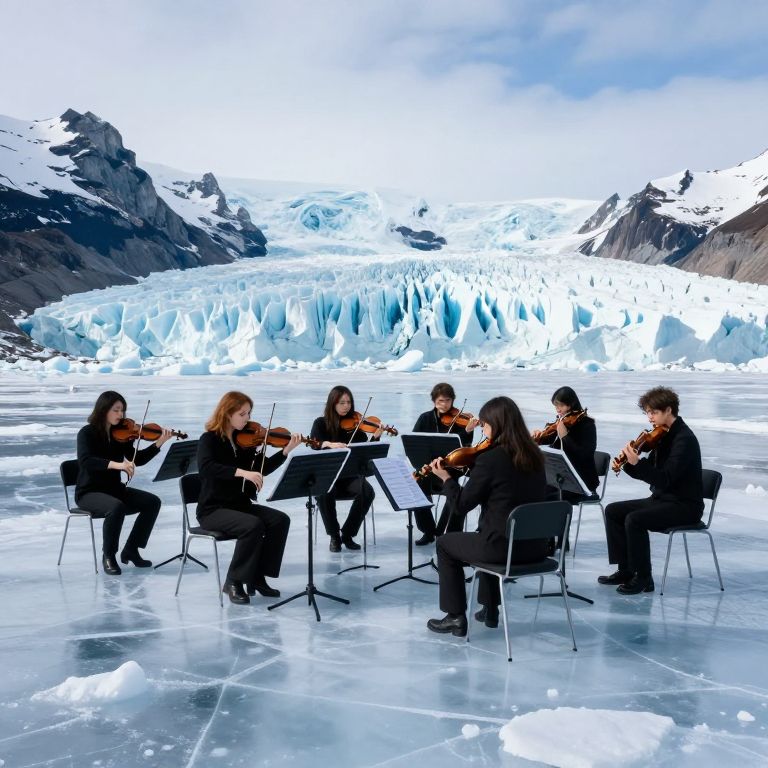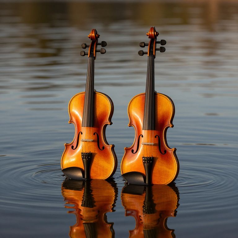 Violinists suspended mid-air gracefully glide atop sheets of music that float serenely over a tranquil lake, their silhouettes mirrored perfectly in the still water below, creating a dreamlike symphony of impossible harmony.