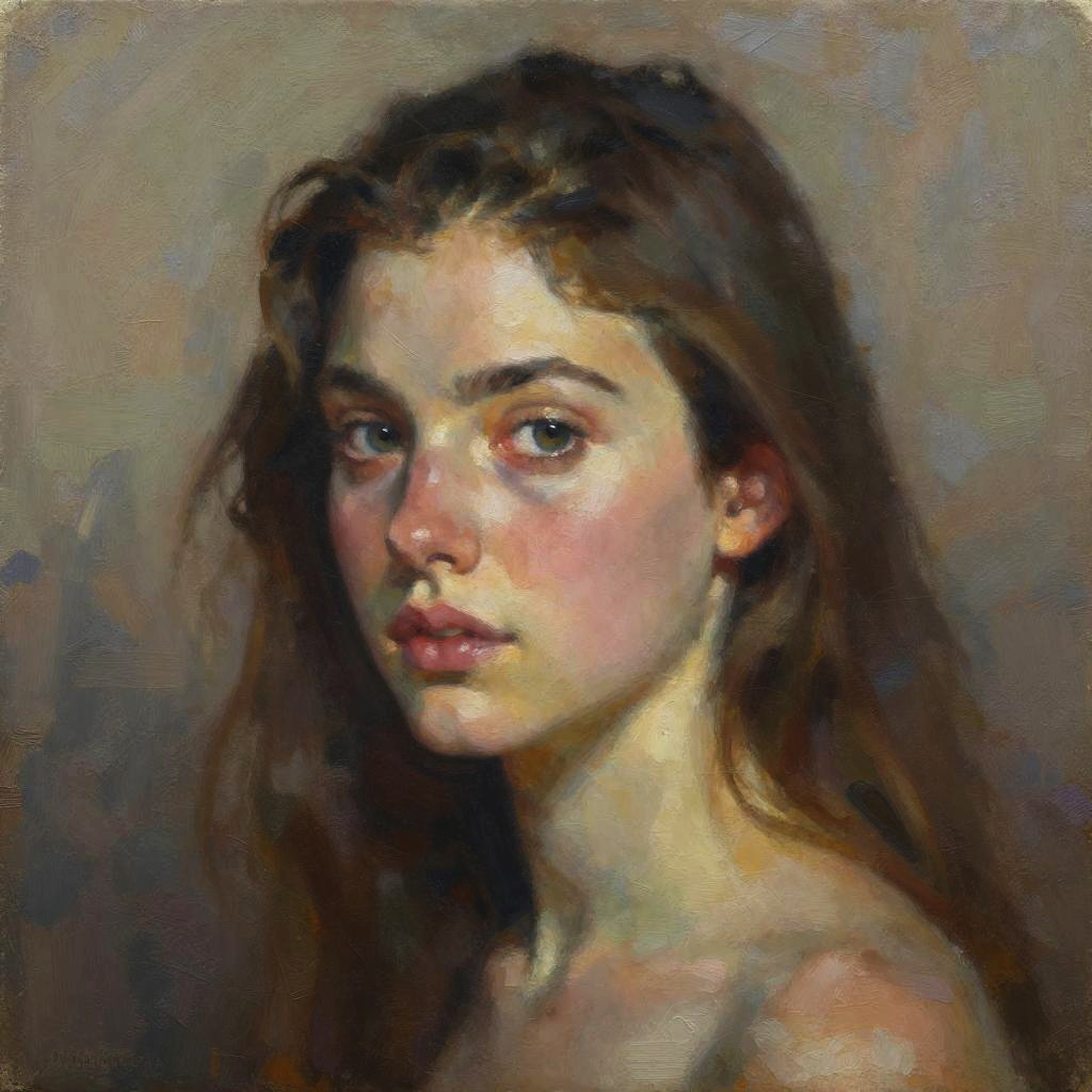 Impressionist-style painting of a young woman with long brown hair, pale skin, and expressive brown eyes, against a muted gray background.