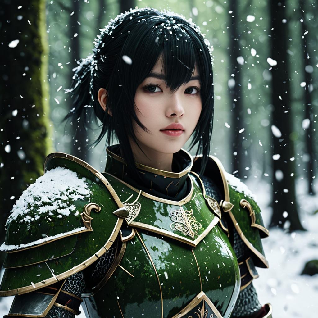 Portrait focus of knight beautiful 3d anime girl, green moss armor wearing, dark forest background, snowing, bokeh, inspired by masami kurumada, digital painting, high contrast, unreal engine render, volumetric lighting, high detail