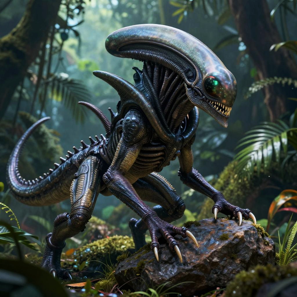 Fierce crocodile xenomorph in a dense jungle, metallic ridges along its spine, amphibious texture with armored plating, sharp talons gripping a rock, bioluminescent patterns on its elongated head, hyper-detailed alien creature design, dynamic pose
