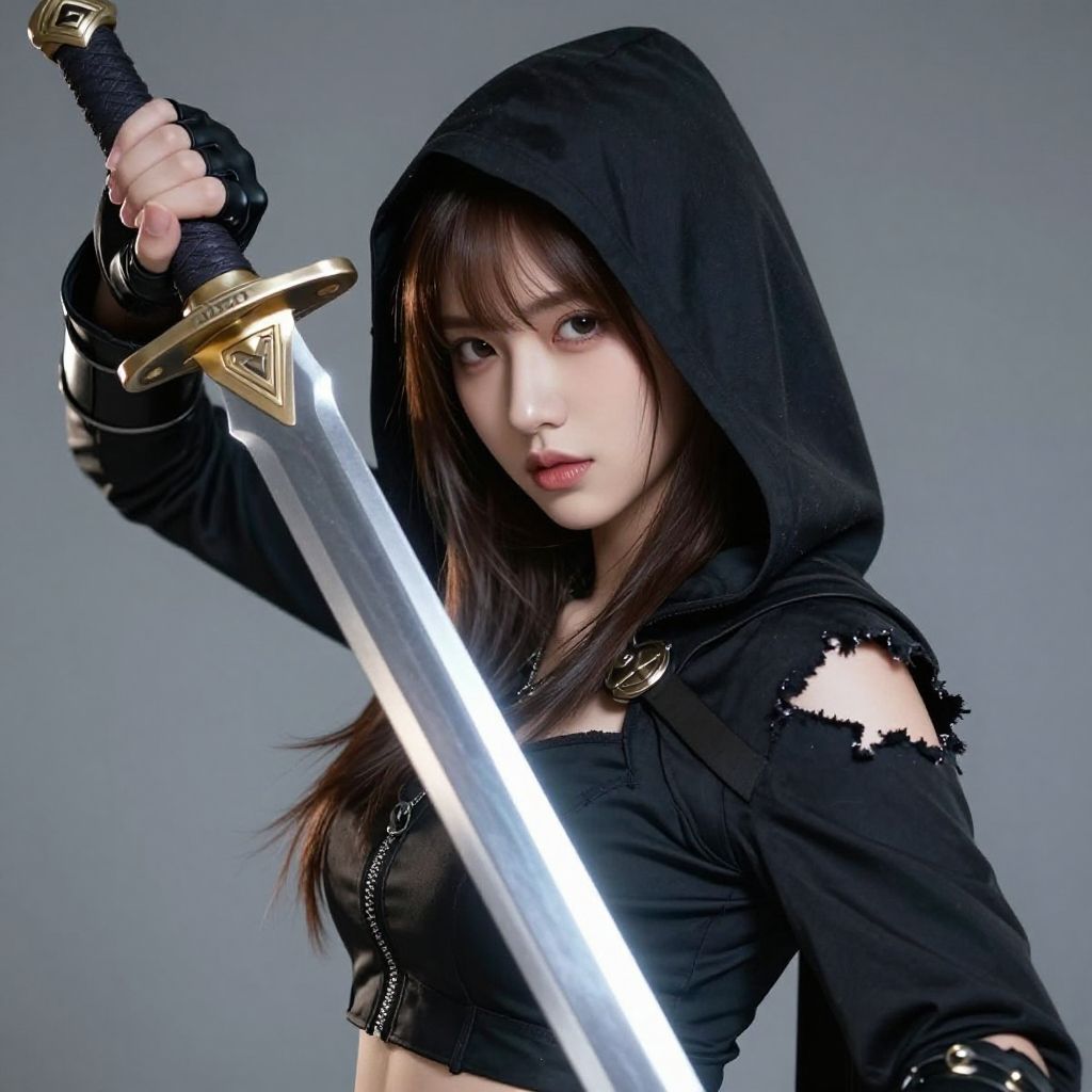 Photograph of an Asian woman with fair skin and long brown hair, wearing a black hooded jacket with torn sleeves, holding a gleaming silver sword with a gold triangular guard in her right hand. She has a serious expression and is looking directly at the camera. The background is a plain, gradient gray. Her jacket is zipped up to her neck, and she wears black fingerless gloves. The image has a sharp, high-contrast style, emphasizing the sword's reflection and her determined gaze.