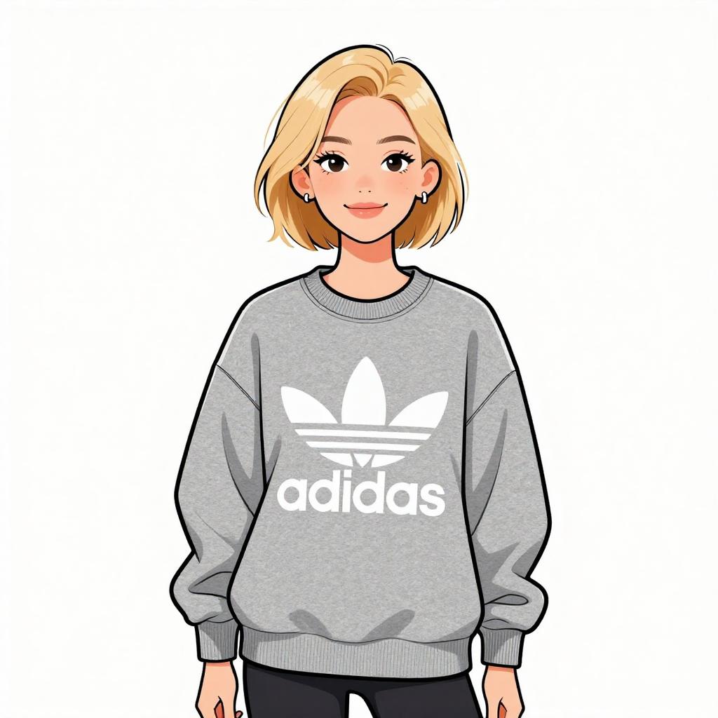 Woman with pretty face and pretty hair. smiling Woman, casual sportswear, oversized grey sweatshirt with Adidas logo in white, ribbed neckline, long sleeves, mid-thigh length, minimal jewelry with a small visible tattoo on the forearm, short bleached blonde hair, plain white background. --sref 1467