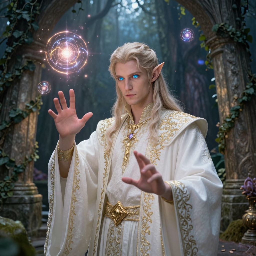 Fantasy handsome male elf mage conjuring arcane spells in a mystical grove, sapphire blue eyes shimmering with magic, elegant robes embroidered with gold, surrounded by floating glowing orbs, ancient stone pillars covered with ivy, dramatic lighting and magical effects.