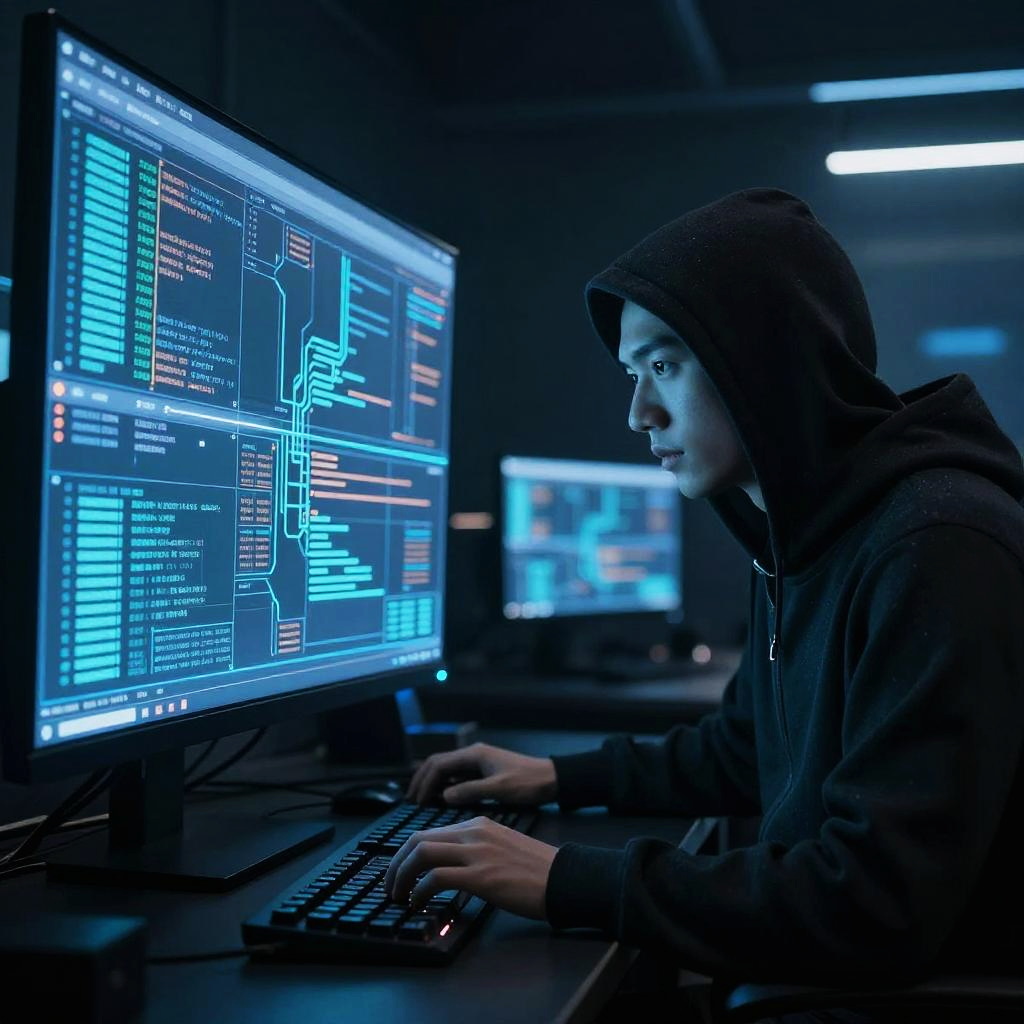 Coldlit.com cybernetic hacker in a dark room lit by cold blue LEDs, streams of data flowing on transparent screens, high tech immersive environment