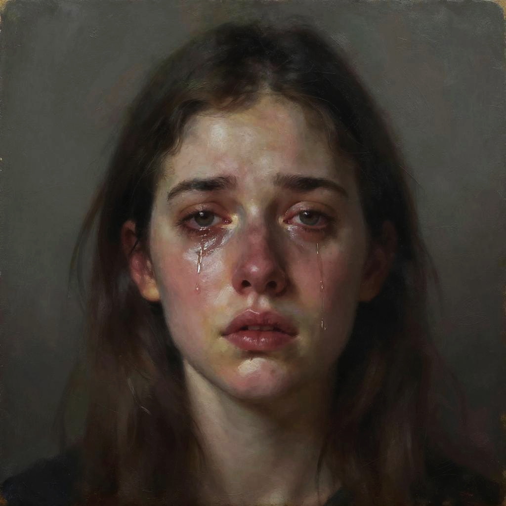 Very sad woman, oil painting, tears streaming down cheeks, desaturated colors, moody lighting, high detail, realistic style