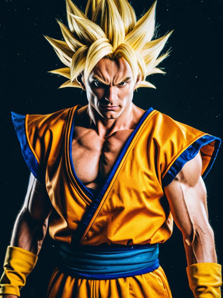 Photorealistic editorial portrait of a muscular man wearing a Super Saiyan costume from the Dragon Ball series. The subject features spiked, bright yellow hair styled to resemble the iconic transformation and wears a blue and orange sleeveless martial arts outfit. The image captures the intense and focused expression of the subject against a dark background.