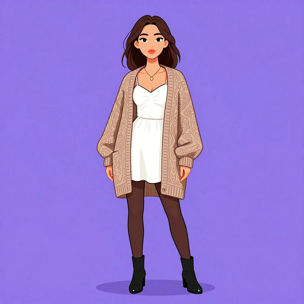 Woman with pretty face and pretty hair. Woman, boho-chic, oversized knit cardigan in taupe with intricate patterns, mid-thigh length with ribbed hem, layered over a simple white sundress, thin straps, subtle ruching at the bust, short flared skirt, sheer black tights, black ankle boots with a moderate heel, minimalist gold pendant necklace, studio background --sref 1461
