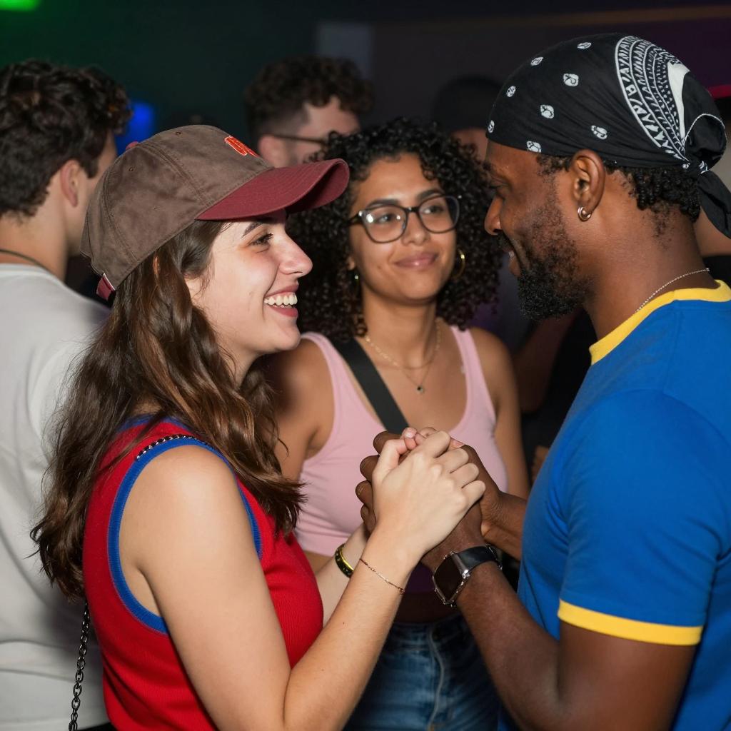 Photograph of a crowded party. Foreground: smiling woman with long brown hair, red and blue sleeveless top, brown and red cap. Beside her, curly-haired woman with glasses, pink top. To the right, man with dark skin, black bandana, blue shirt, yellow collar. Green and blue lighting. Multiple people in background. Woman and man holding hands, woman's hand on man's chest.