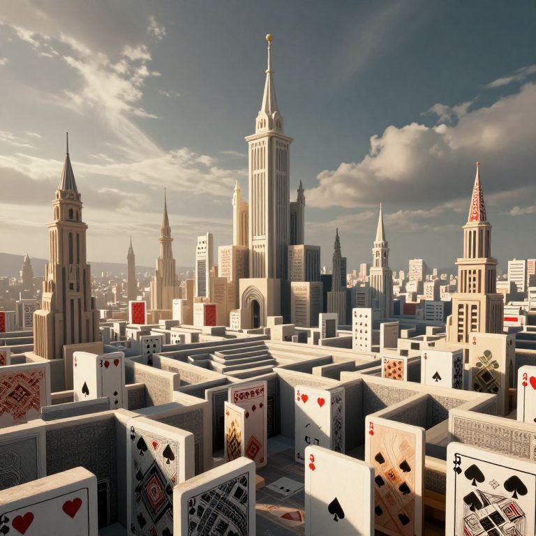 A surreal metropolis emerges from a labyrinth of towering playing card blocks, where whimsical spires and impossible architecture stand defiantly against a moody, dreamlike sky.