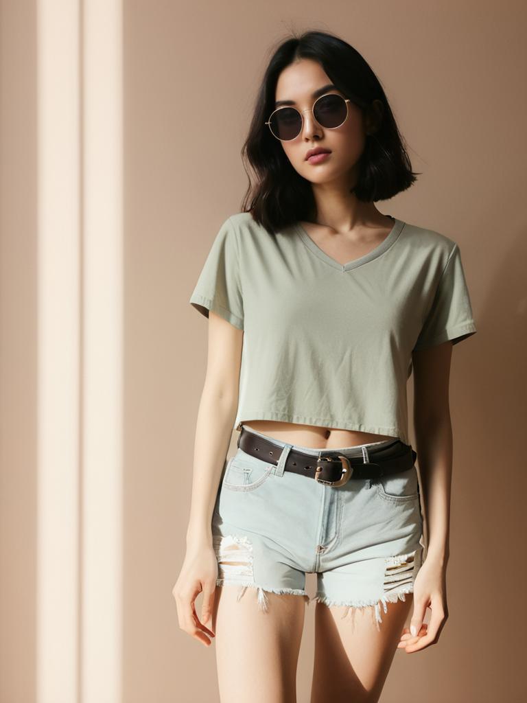 Woman, casual, olive green crew neck t-shirt with white and red graphic print, short sleeves, frayed denim shorts with distressed details, mid-rise, black belt with metallic chain accent, oversized dark sunglasses. --sref 1400