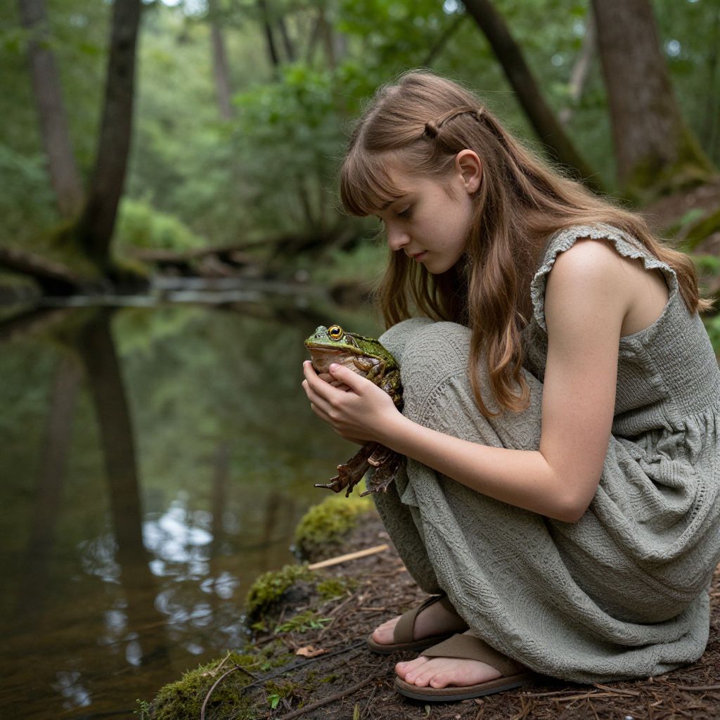 In a serene woodland setting, a young woman cradles a frog, her gentle touch symbolizing the delicate balance between humanity and nature, while the tranquil pond reflects a harmonious connection to the earth, evoking a profound sense of wonder and introspection.