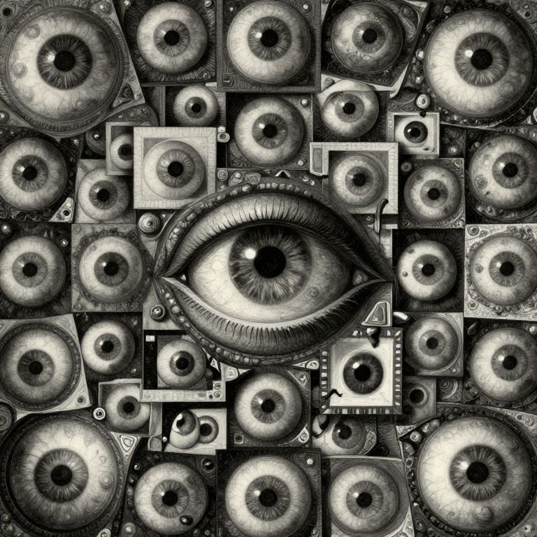 The image presents a highly intricate and detailed composition, reminiscent of Giambattista Piranesi's style, with a strong horror theme. Dominating the center is a large, dark eye surrounded by a series of overlapping squares, each containing an eyeball. These squares extend outward in a radial pattern, creating a sense of depth and infinity. The squares are interspersed with various textures, including metallic surfaces and organic forms, adding to the eerie atmosphere. The overall color palette is monochromatic, with shades of black, gray, and white, enhancing the ominous feel. The spatial relationships are complex, with the squares and eyeballs appearing to overlap and intermingle, creating a sense of chaos and disorientation. The composition is tightly packed, with no empty space, and the elements are arranged in a way that draws the viewer's eye through the image, from the central eye to the surrounding squares and eyeballs. The interplay of shapes, textures, and colors creates a visually rich and dynamic scene, capturing the viewer's attention and evoking a sense of horror.
