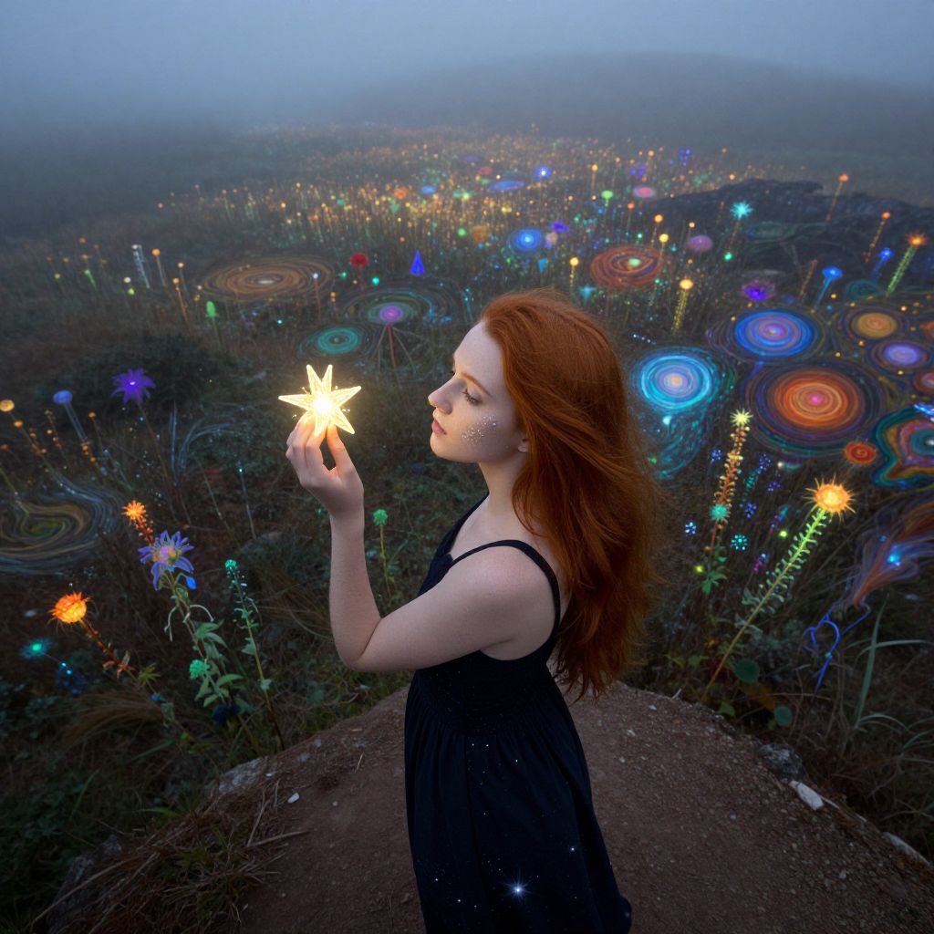 Photograph of a fair-skinned, red-haired woman with delicate features standing on a dirt path in a misty, twilight landscape. She wears a black, sleeveless dress and holds a glowing, yellow star-shaped light in her right hand. The background features a dark, foggy field filled with vibrant, glowing, multicolored flowers and circular lights, creating a whimsical, surreal atmosphere. Her serene expression and the ethereal setting evoke a magical, dreamlike quality. The image is rich in contrasting colors and textures, with the woman's pale skin and dark dress against the colorful, illuminated flora.