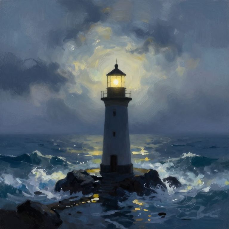 A captivating blend of impressionistic techniques and digital artistry brings to life an evocative scene of a solitary lighthouse standing defiant against a tumultuous sky. From an elevated vantage point, the lighthouse's silhouette merges seamlessly with the far-off horizon, instilling a sense of seclusion and fortitude in equal measure. The vivid brushstrokes gracefully dance across the canvas, portraying the wavering light as it pierces through the swirling mists, illuminating the surrounding waters and casting otherworldly shadows upon the tumultuous waves below. As reflections gleam on the damp rocks at its foundation, this enchanting tableau - reminiscent of an emotional landscape - engulfs viewers in a deep atmosphere of solitude and endurance against the relentless forces of destiny.