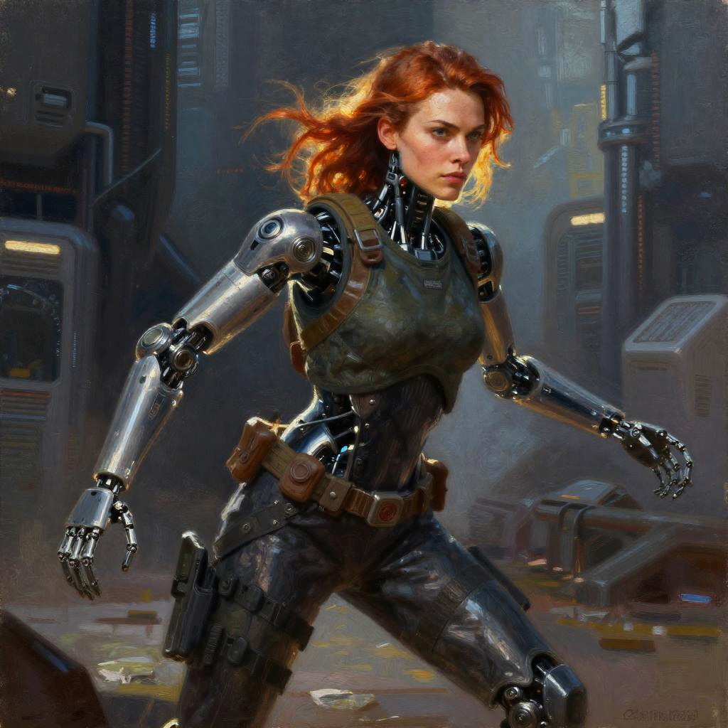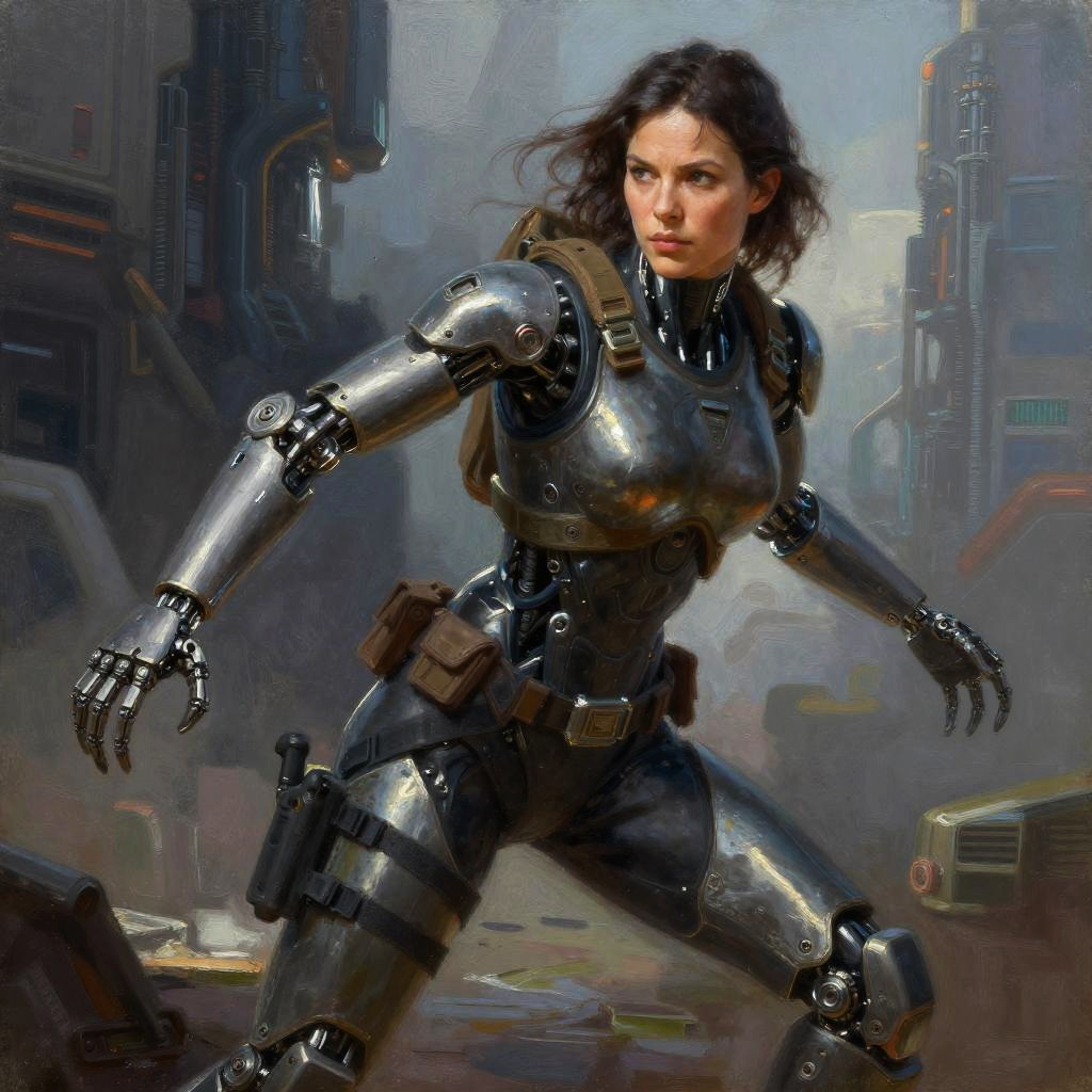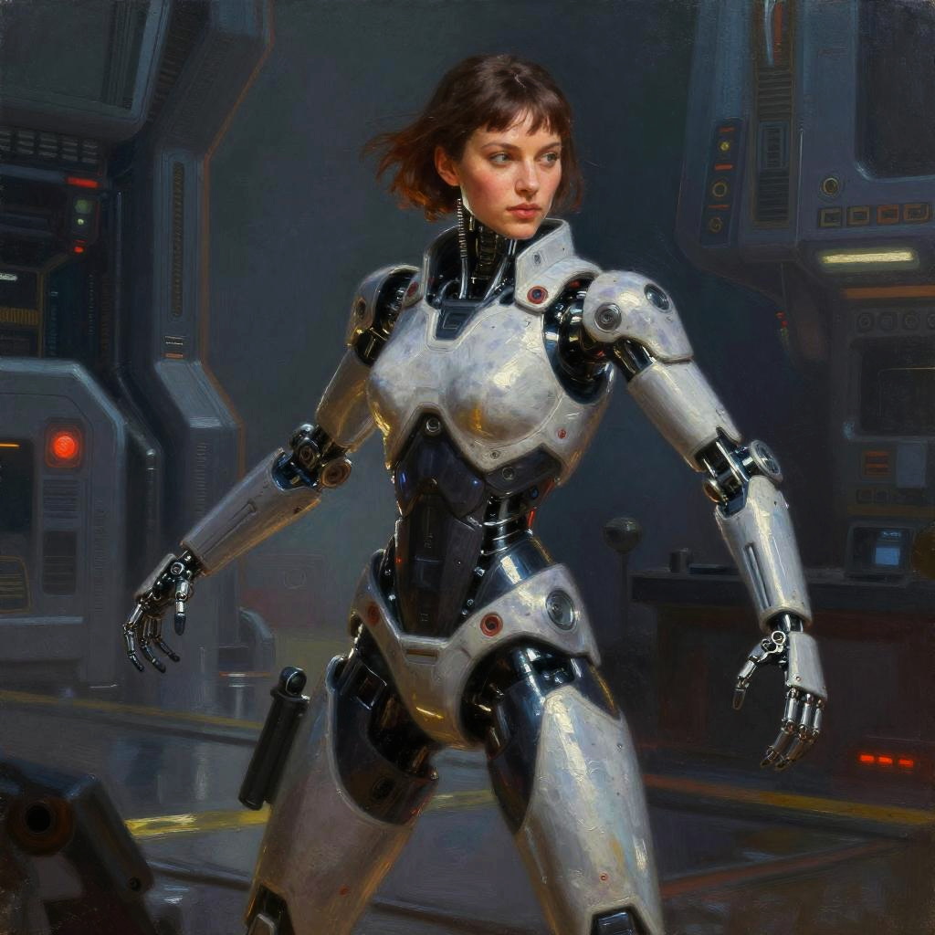 ((oil painting)) of attractive female modern Scout Leader with cybernetic limbs, part cyborg, on patrol, cinematic, dynamic pose, fine details, reflections, 8k, ((dark shot)), soft volumetric lights, (backlit:1.3), (photorealistic:1.3), (Style-Glass), hdr, antialiased, ((syd mead)), sharp details, detailed background, ((masterpiece)), (painterly), (good anatomy), (good proportions), (good composition), (dramapaint), (analogue style), (empty hands), (futuristic scifi background)