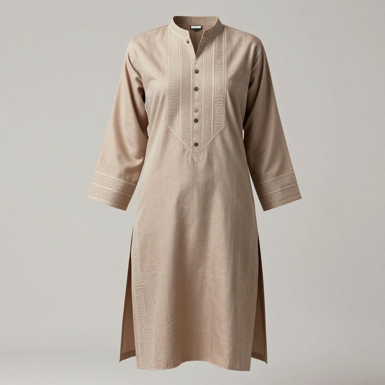 Photograph of a beige, long-sleeved, button-down traditional tunic with intricate embroidered patterns on the collar, cuffs, and hem, set