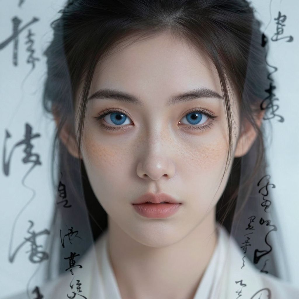 A captivating double exposure portrait showcases a young woman with piercing blue eyes and delicate freckles across her nose. Ancient Chinese calligraphy, translucent and ethereal, flows gracefully around her face. Soft, diffused light accentuates the interplay between her sharp facial features and the elegant Asian script, creating an atmosphere of introspection and wisdom. As one's gaze travels beyond her expressive eyes, they are drawn into a world where these cryptic characters merge seamlessly with her skin, suggesting a story waiting to be unveiled.
