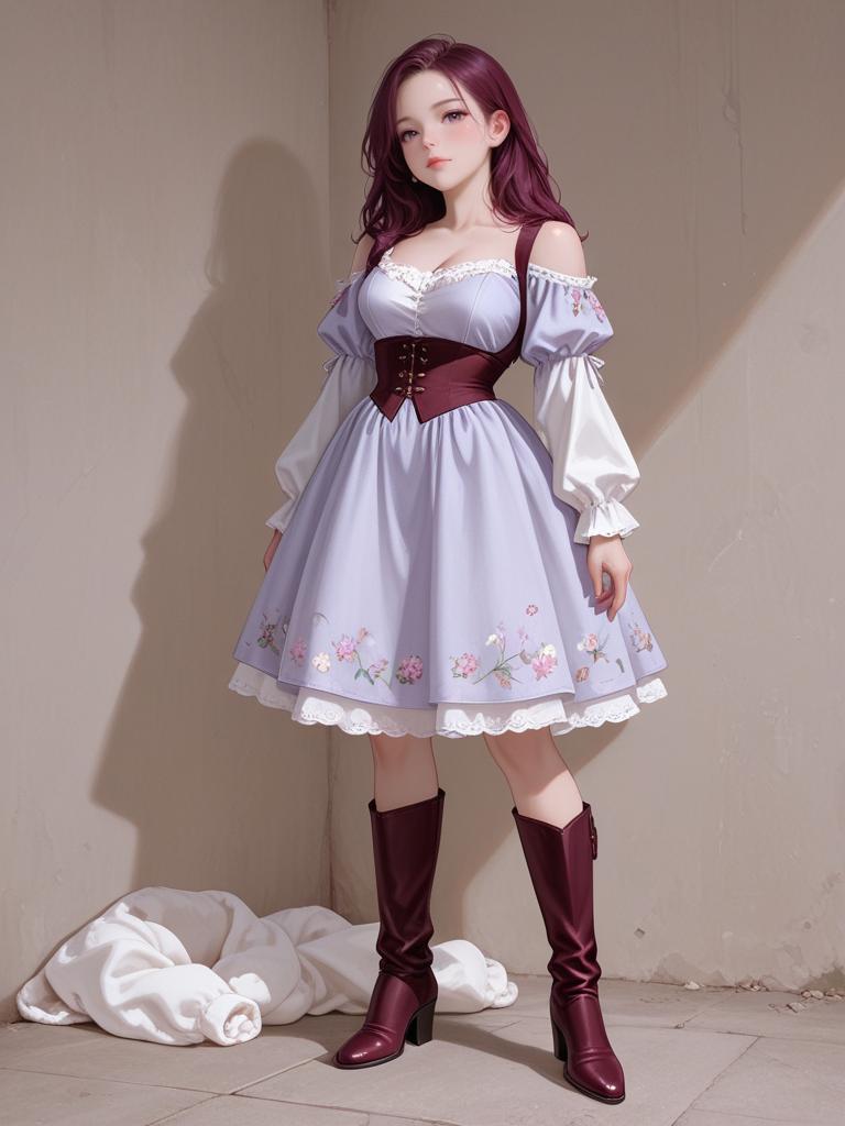 1girl, realistic face, Thigh-high suede boots, rich burgundy, rounded toe, block heel, cold shoulder dress, lightweight cotton blend, pastel lavender, fitted bodice, flared skirt, subtle floral embroidery, sheer overlay.
