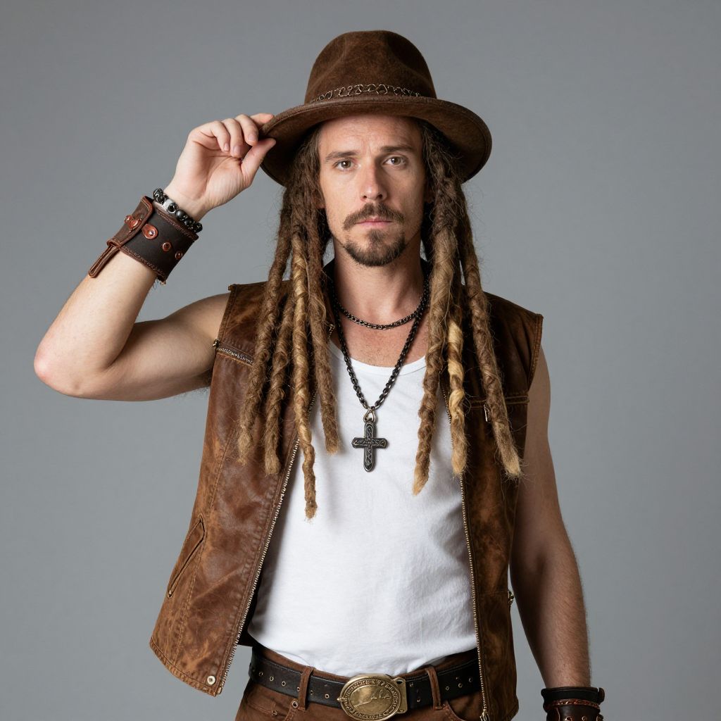Adult Right Hippie Costume, man with dreadlocks and a hat on his head