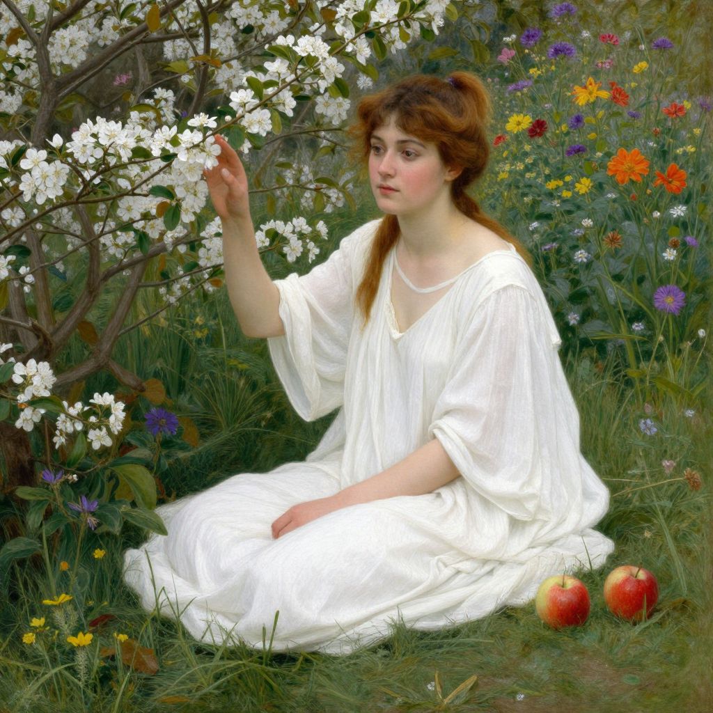 This is a digital painting depicting a young woman with fair skin and long auburn hair, sitting in a lush, colorful garden. She is dressed in a flowing white gown and is gently touching white flowers on a tree branch with her right hand. Her expression is serene and contemplative. The background is a vibrant mix of green grass, wildflowers in shades of purple, yellow, and orange, and the tree with white blossoms. Two red apples are placed on the grass in the foreground. The overall style is reminiscent of Pre-Raphaelite art, with rich colors and detailed textures.