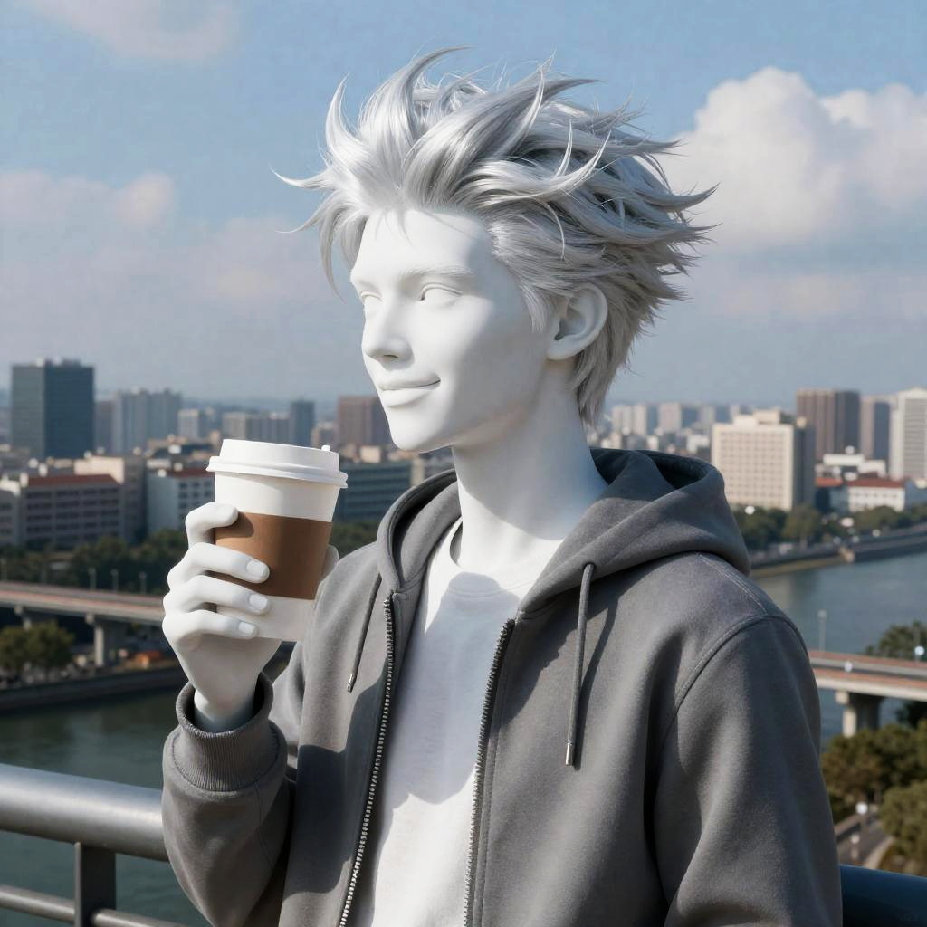 Best quality, masterpiece, photo realistic, Background and character in perfect proportion, intricate details, raw photo, photon rendering, octane render, absurdres, ultra detailed, detailed face, detailed skin, trending on artstation, 8k masterpiece, cinematic lighting, scenery, no humans, cityscape, (Half-body:1.1), sky, city, cloud, outdoors, building, bridge, river, tree, roadn, artist name, (True and realistic white skin), a slim figure, Fashion clothes, (a shallow smile:1.4), Super high resolution, Coffee in hand, (Real realistic background), Light Edition Light, (Silver Spiked Hair:1.3), Blowing hair in the wind