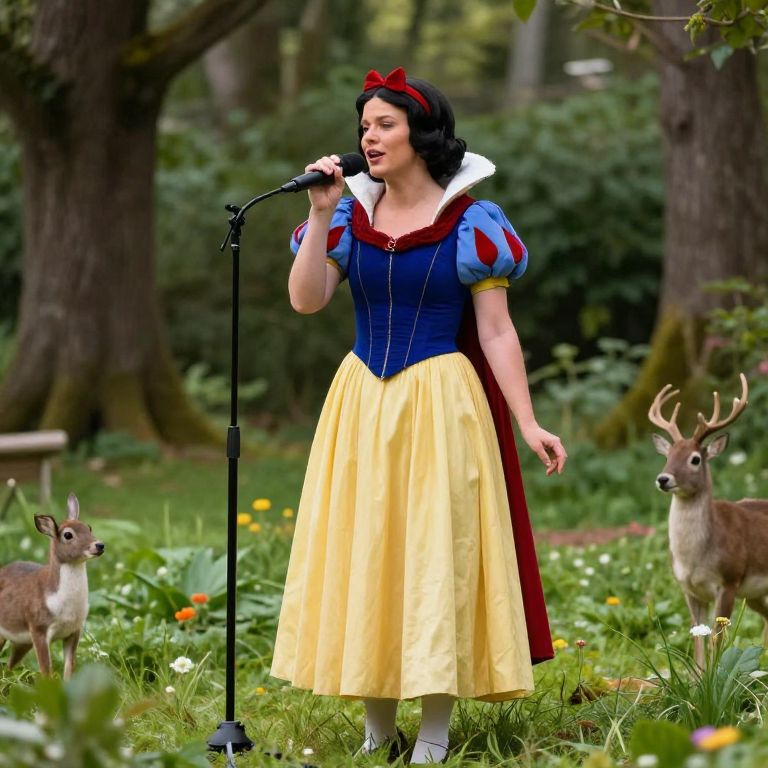 "Steadicam Donald Trump singing dressed as Snow White, hyperrealistic, in a meadow, surrounded by forest creatures,"