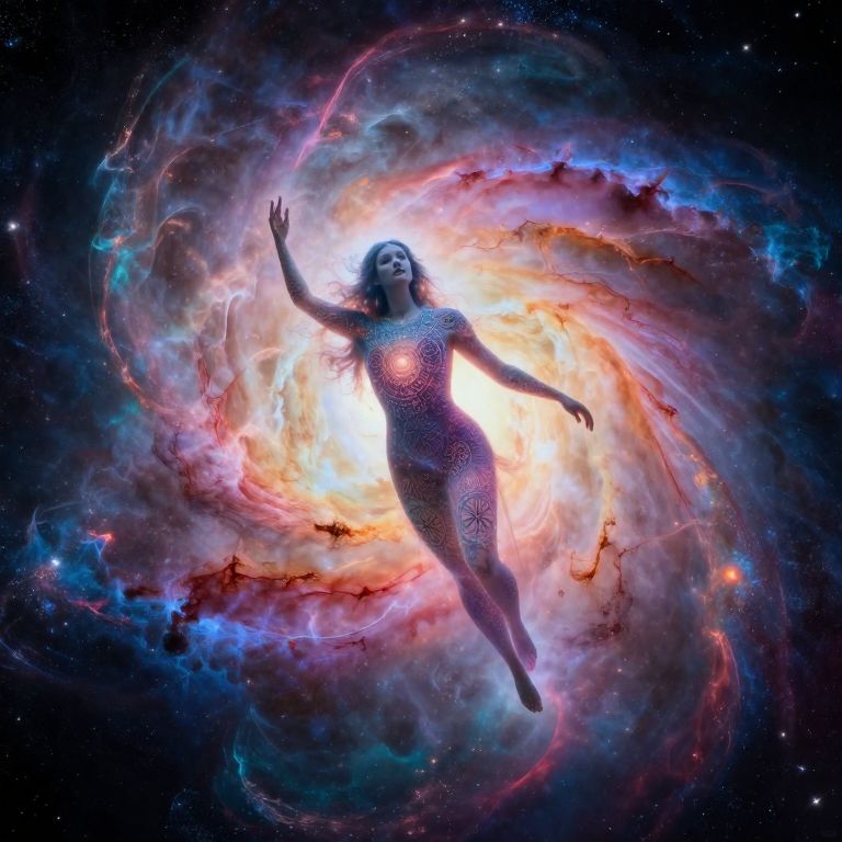 A celestial being with intricate mandala patterns swirls around its ethereal form in this mesmerizing digital artwork, reminiscent of Alex Grey's style. From an aerial perspective, we gaze upon the transcendent entity floating amidst a vibrant nebula, where bursts of cosmic energy radiate in an array of luminous colors. The composition captures a profound sense of spiritual connection and oneness with the universe, evoking both awe and tranquility through its masterful blend of mysticism and science fiction aesthetics.