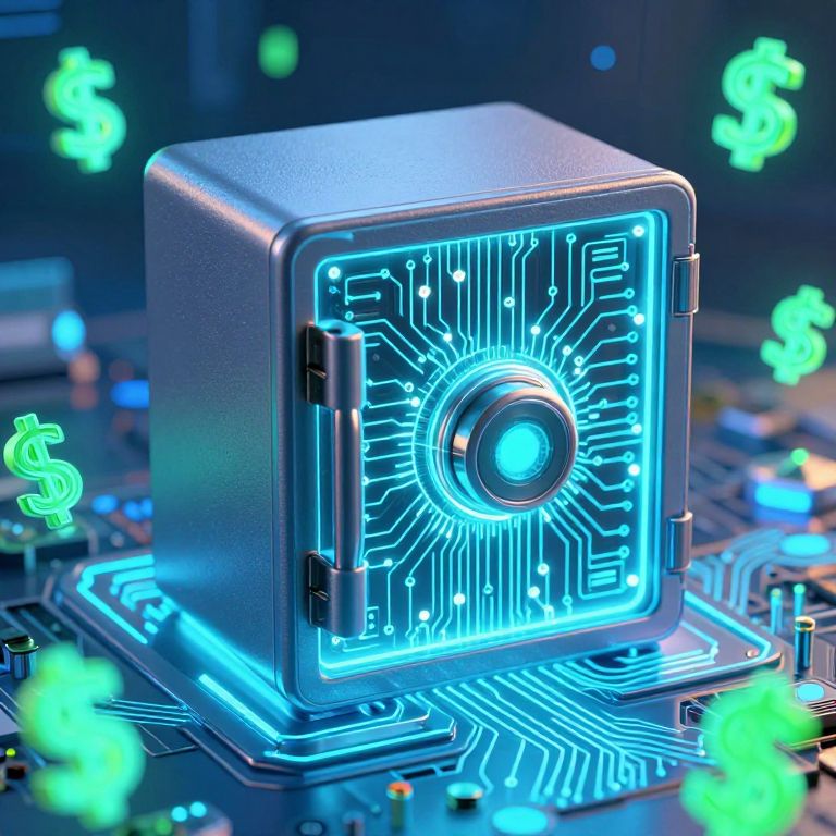 Saver concept with a futuristic digital safe embedded in a glowing circuit board, surrounded by floating currency symbols, vibrant blues and greens, cyberpunk style, high detail, luminous effects, ultra-realistic rendering