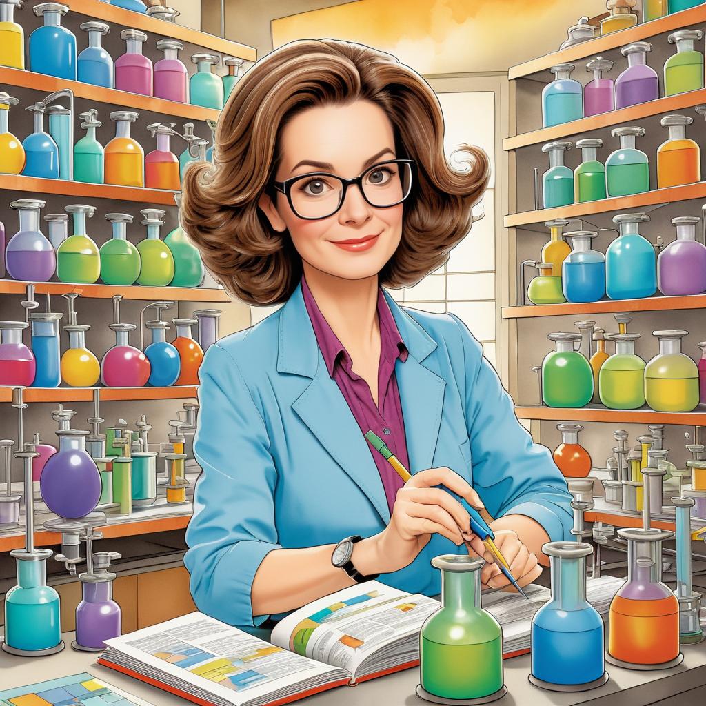 Colorful and humorous book illustration of a chemistry professor who resembles Tina Fey, working in a laboratory, with light brown hair, in the whimsical style of Dr. Seuss, Anton Pieck, and Kat Tzingounakis, funny and playful