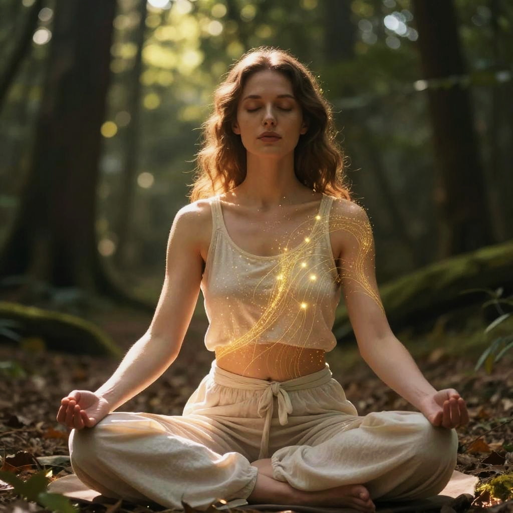 A serene woman meditating in a forest, her body illuminated with ethereal glowing golden particles and light strands, surrounded by soft natural daylight filtering through the trees, mystical and peaceful atmosphere, warm golden and amber color scheme, detailed glowing effects on skin and clothes